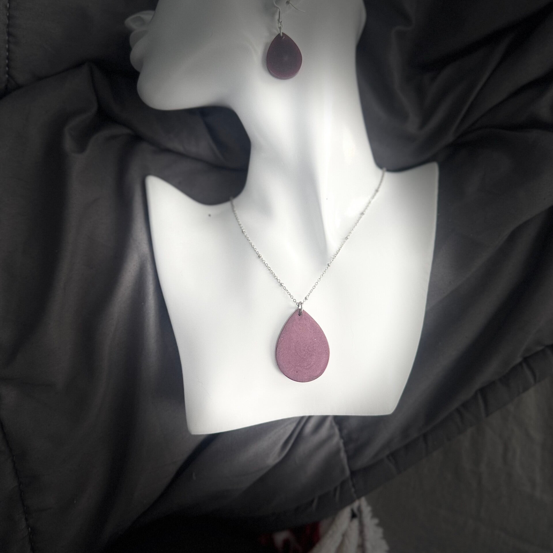 Le duo de boucle d'oreille et collier est en epoxy coloré rouge. Les attaches et la chaînes en acier inoxydable couleur argent. Le collier est d'une longueur de 11 po avec breloque.